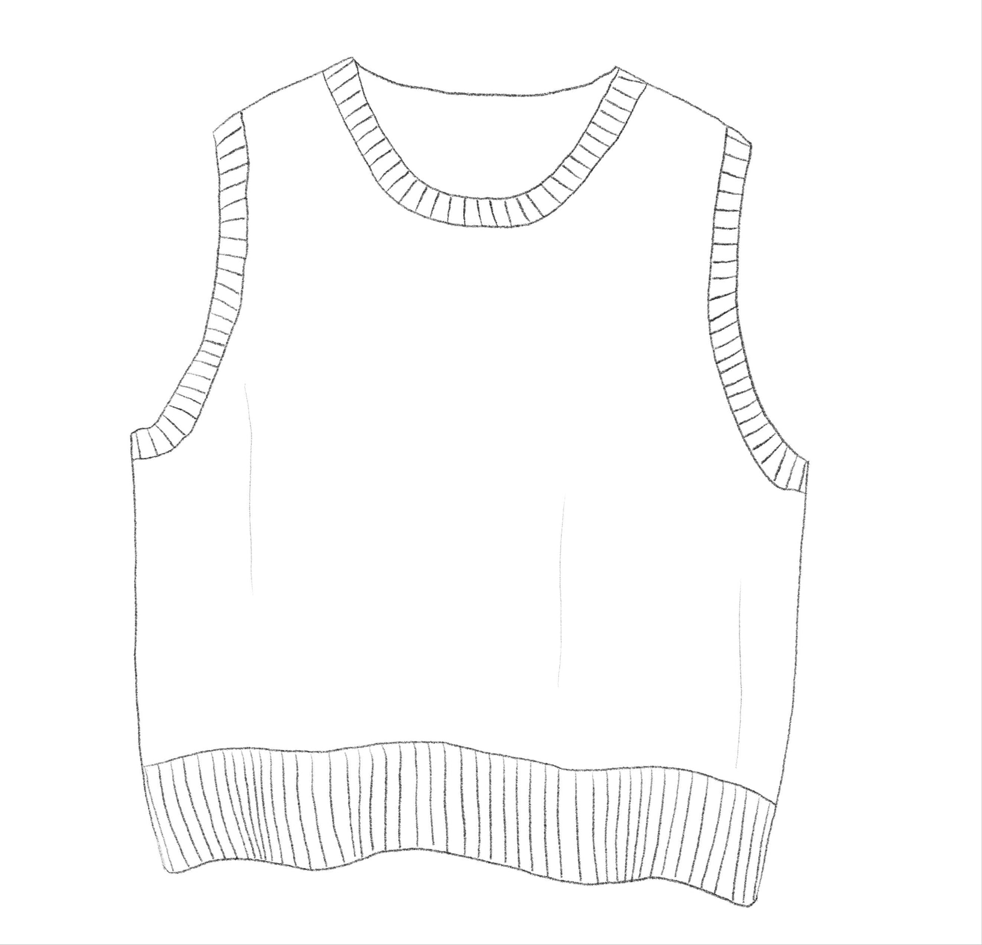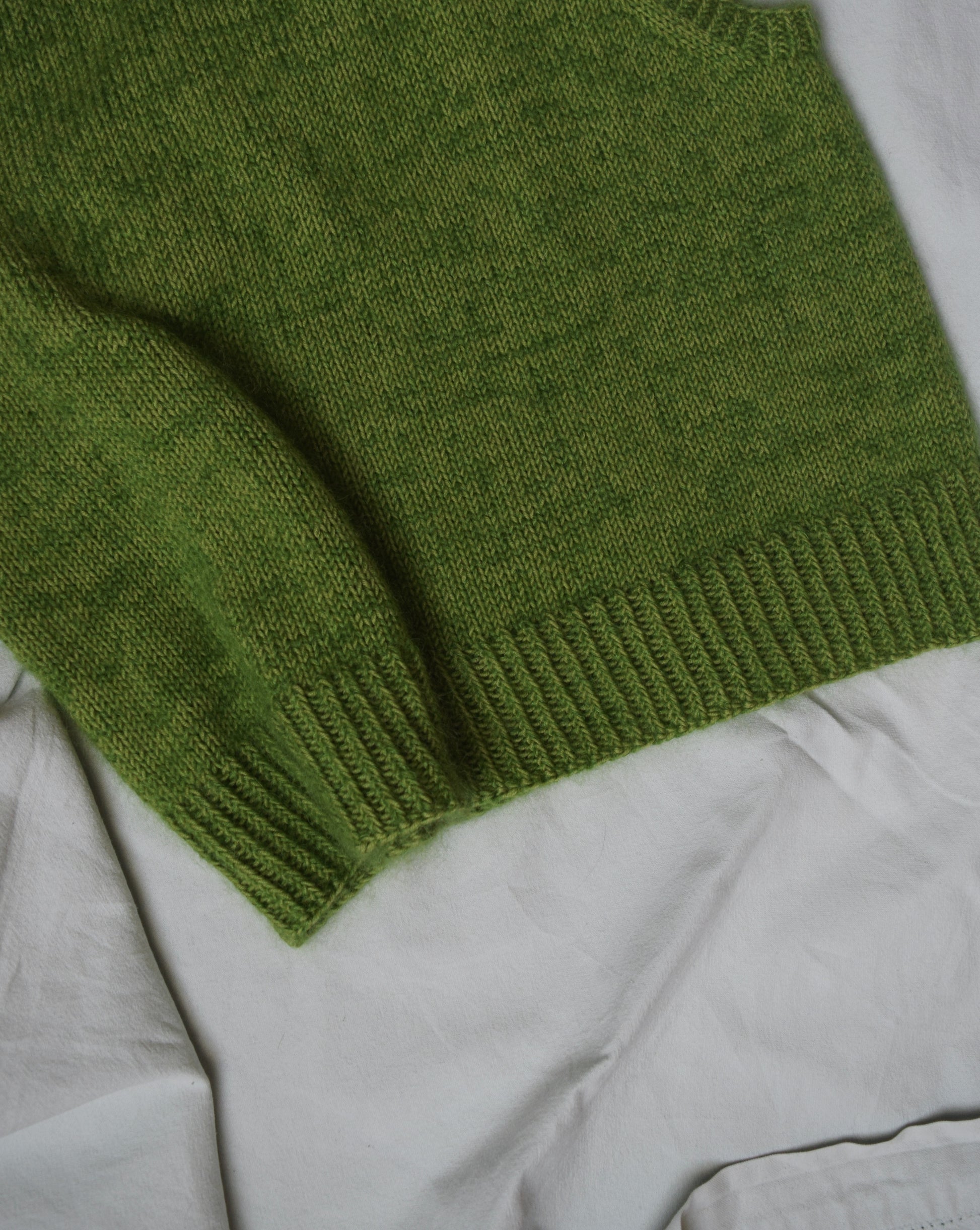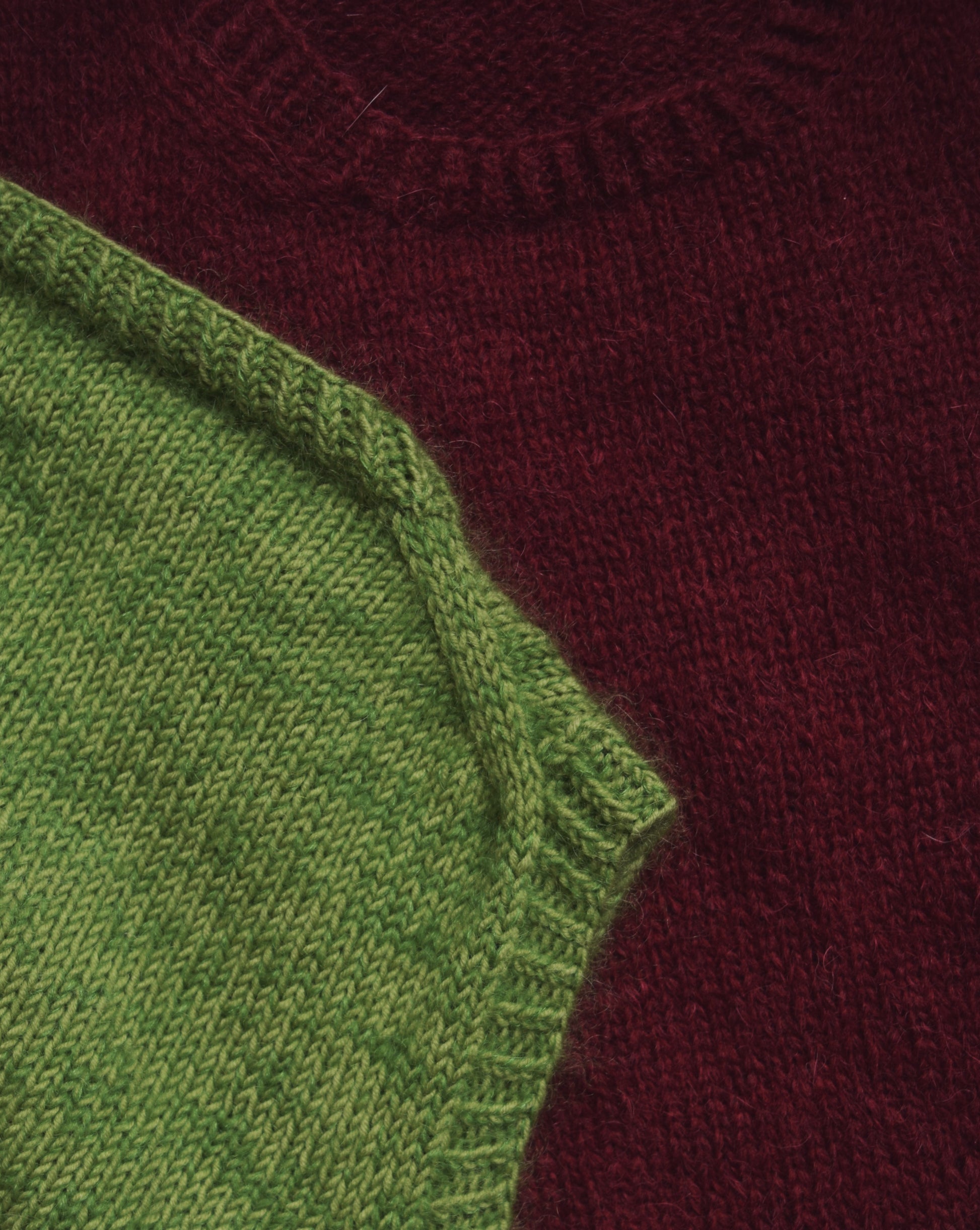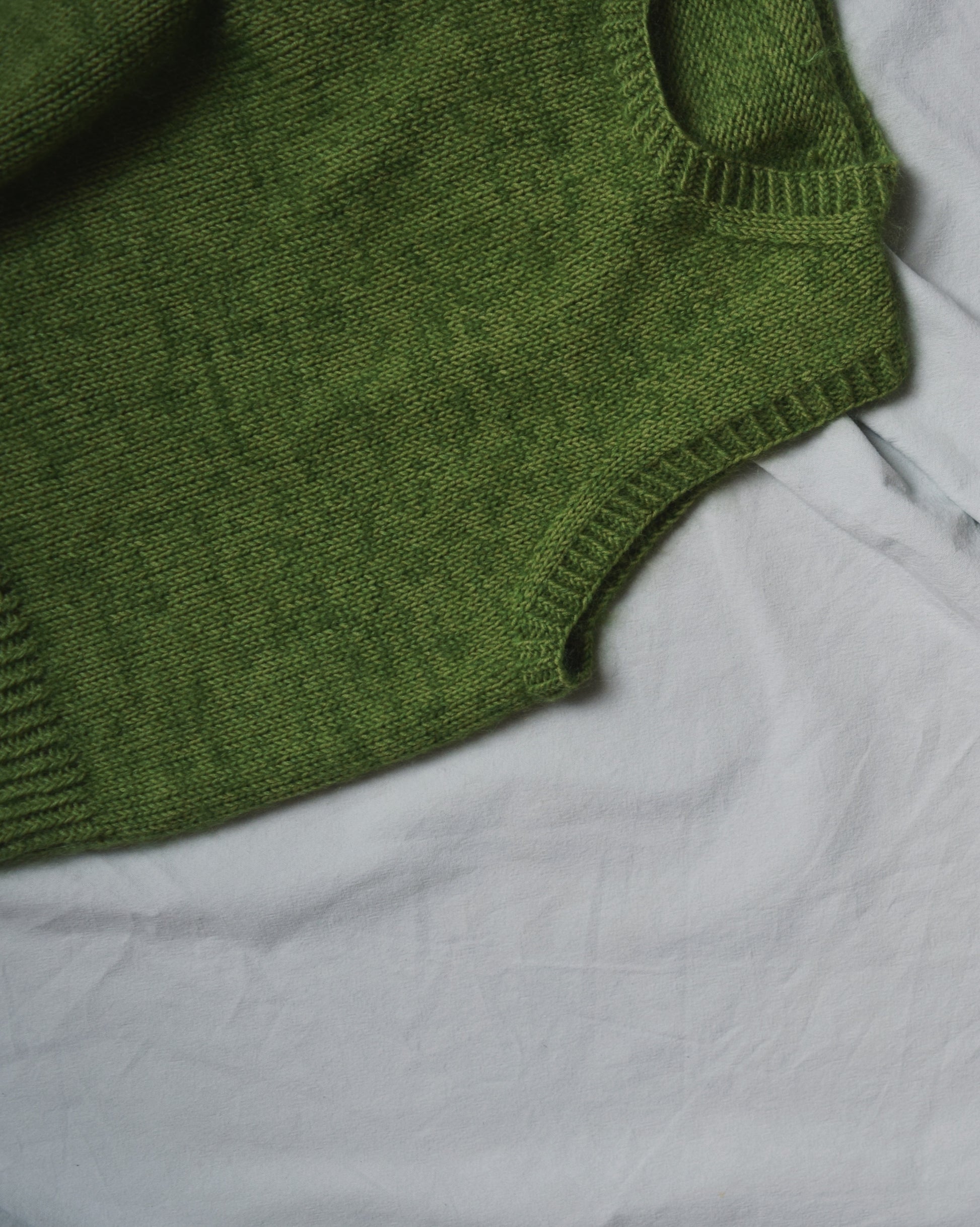 The FNUG slipover is knitted from top to bottom. First, the back yoke is knitted back and forth. Then each shoulder is knit separately, again back and forth. Afterward, the shoulders are joined to form the front yoke. The front and back are then joined together to close the armholes and form the body. The body is knitted entirely in the round. The armhole ribbings are knitted later, in the round, after picking up stitches around the armholes. Finally, the neckline is knitted after picking up stitches around the neck opening.