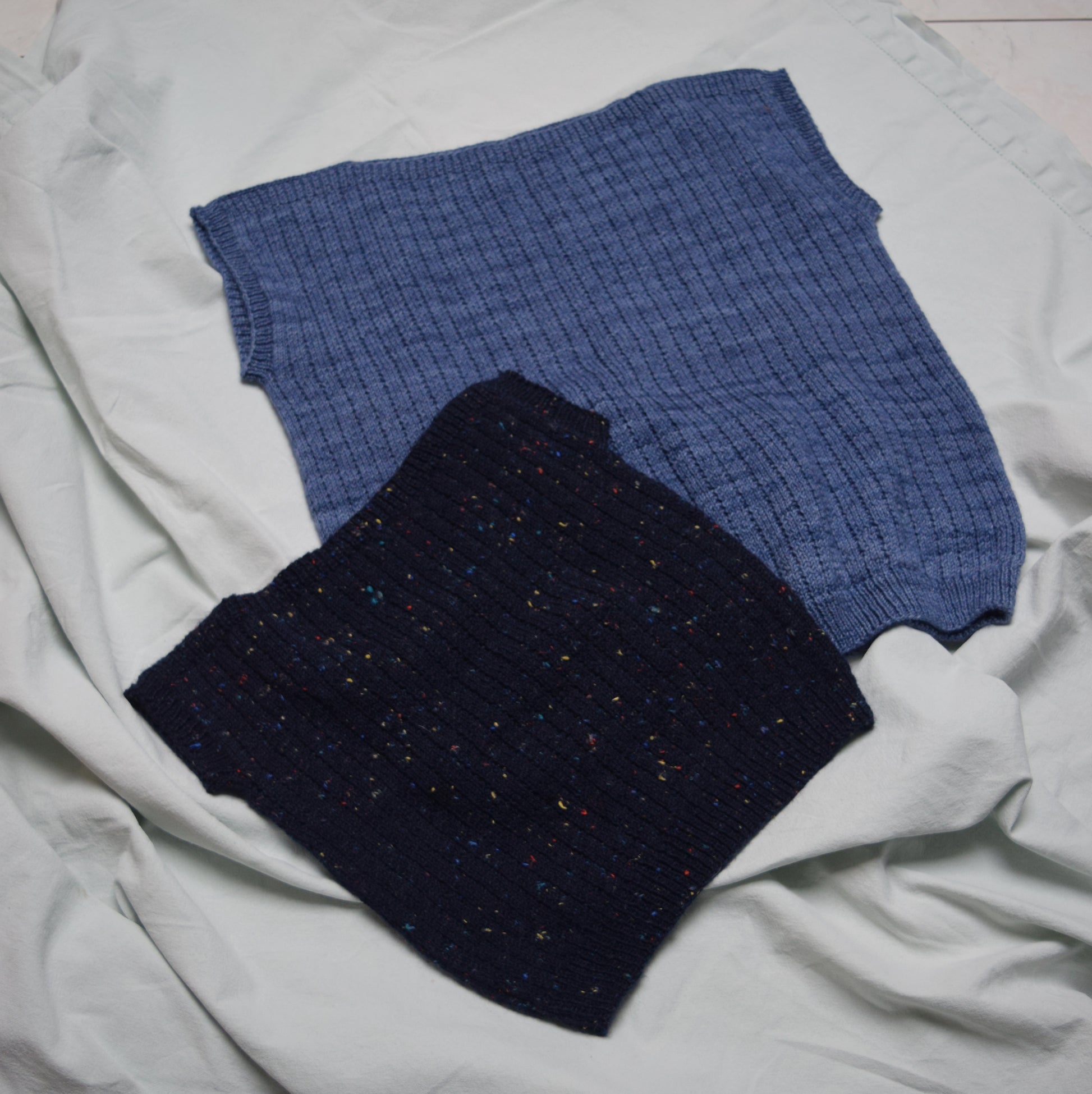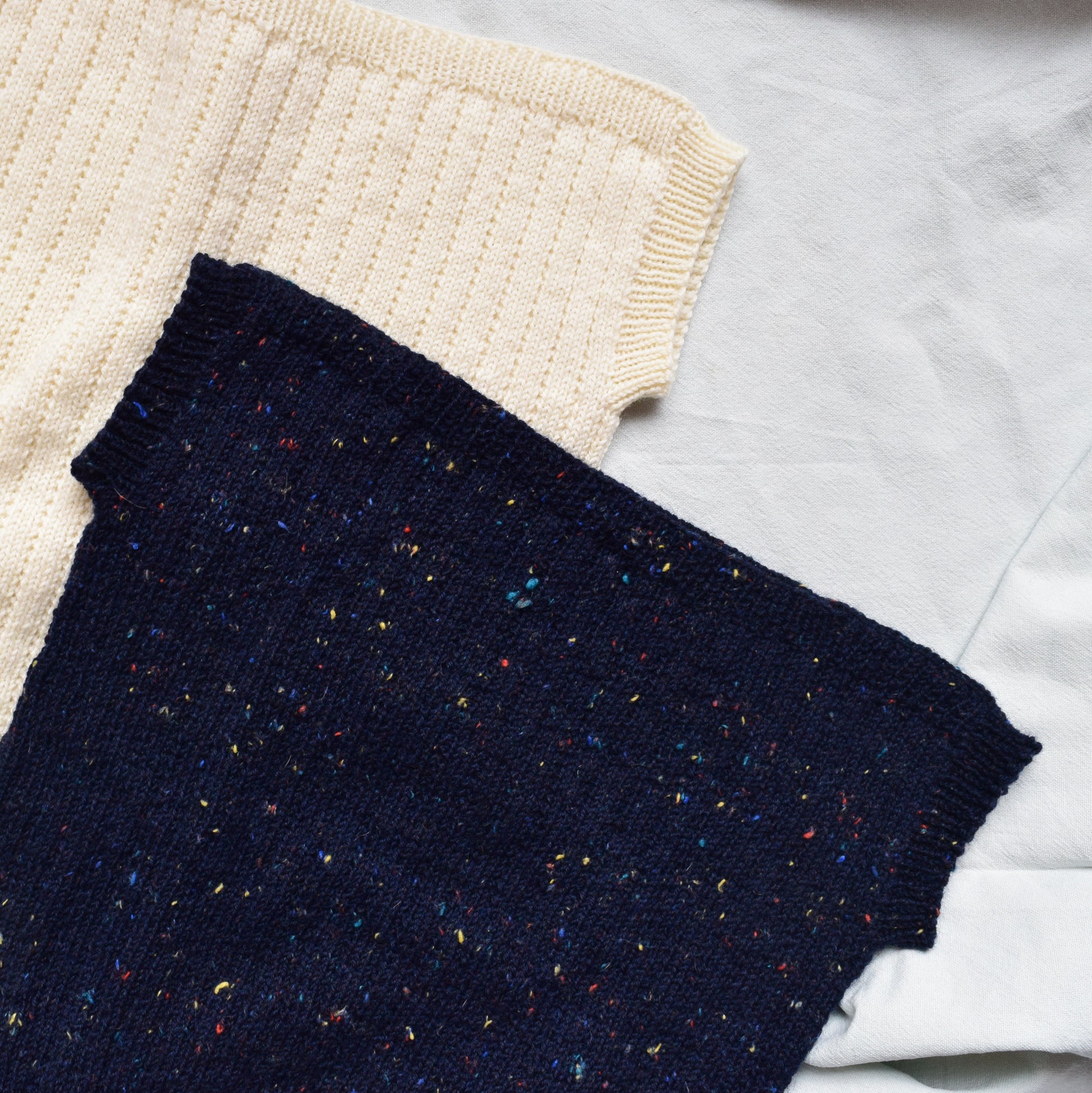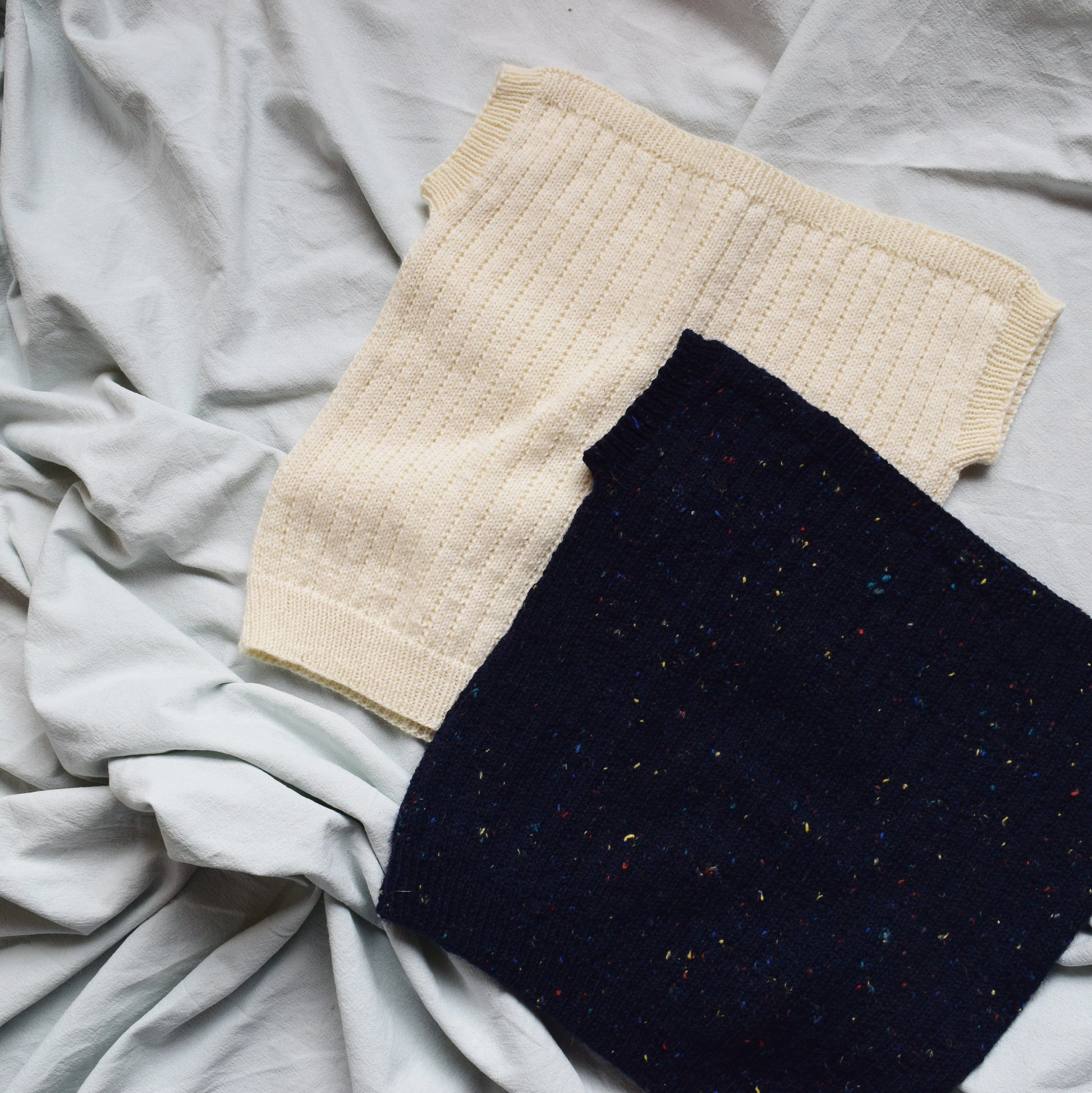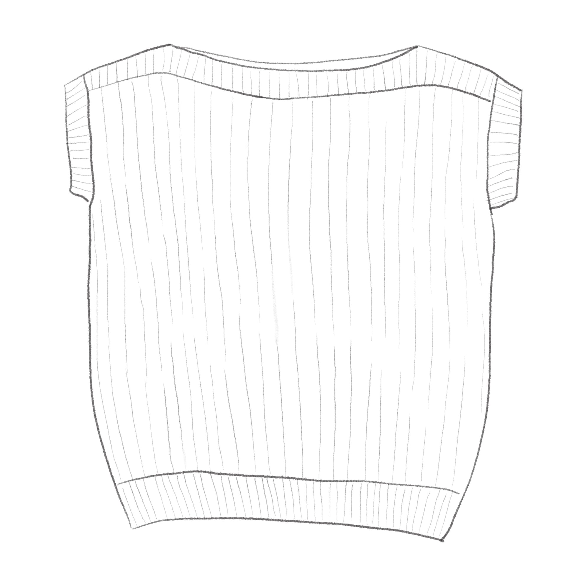The MOSI mini top is knitted bottom-up. In this process, the body is knitted in the round. Later, front and back are split and then you knit them back and forth separately. The shoulders are created by binding off the front and back together. Finally, the little sleeves are knitted in the round.