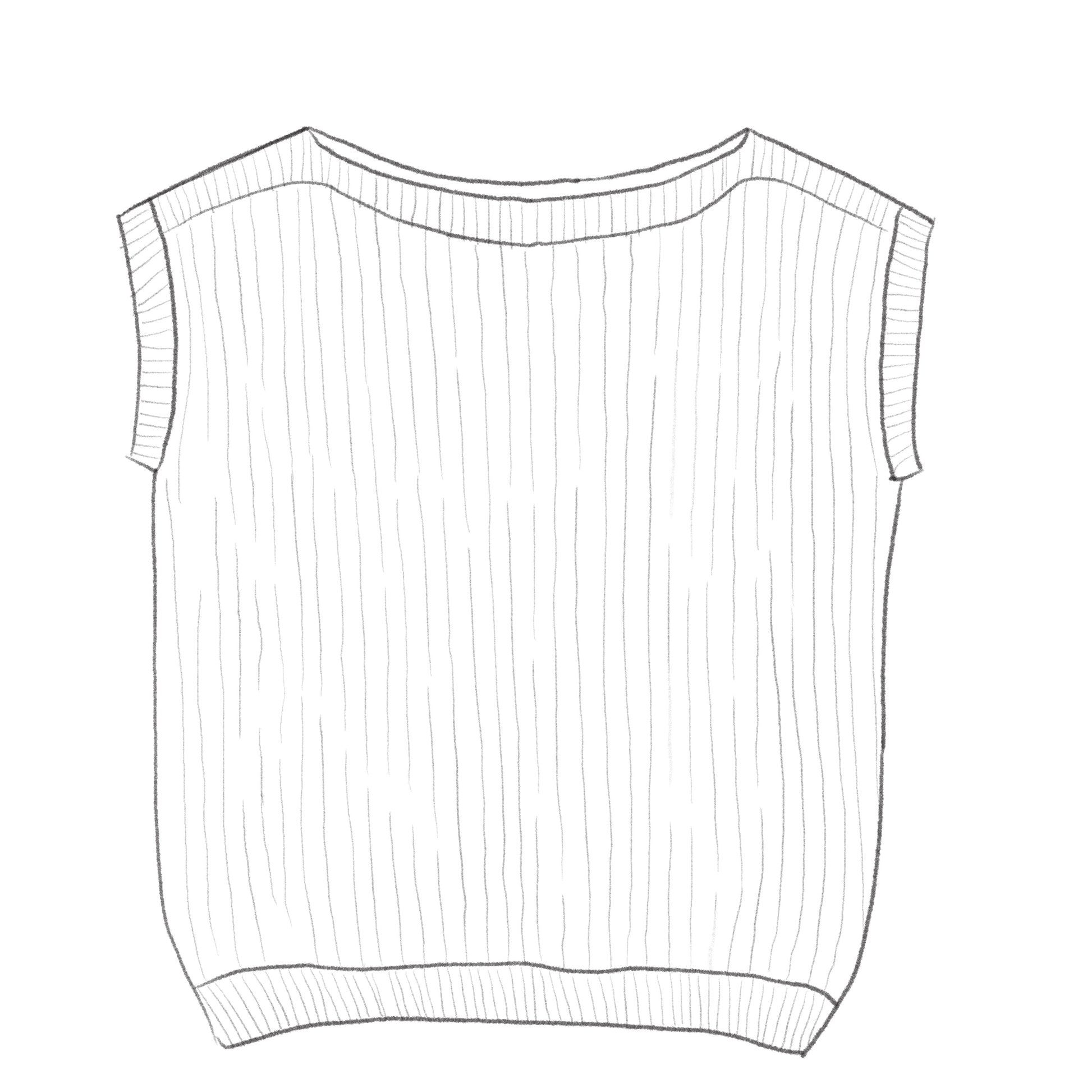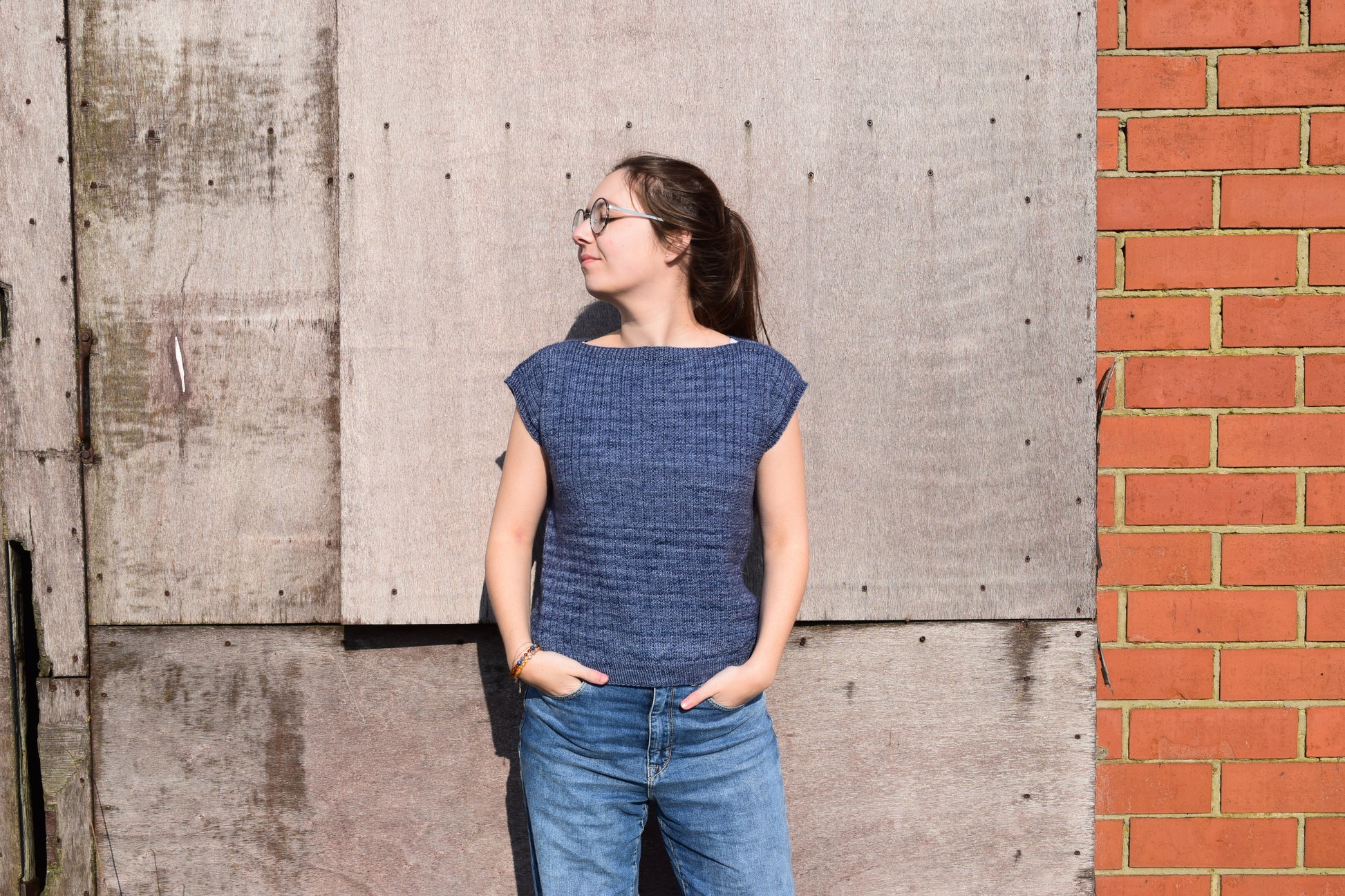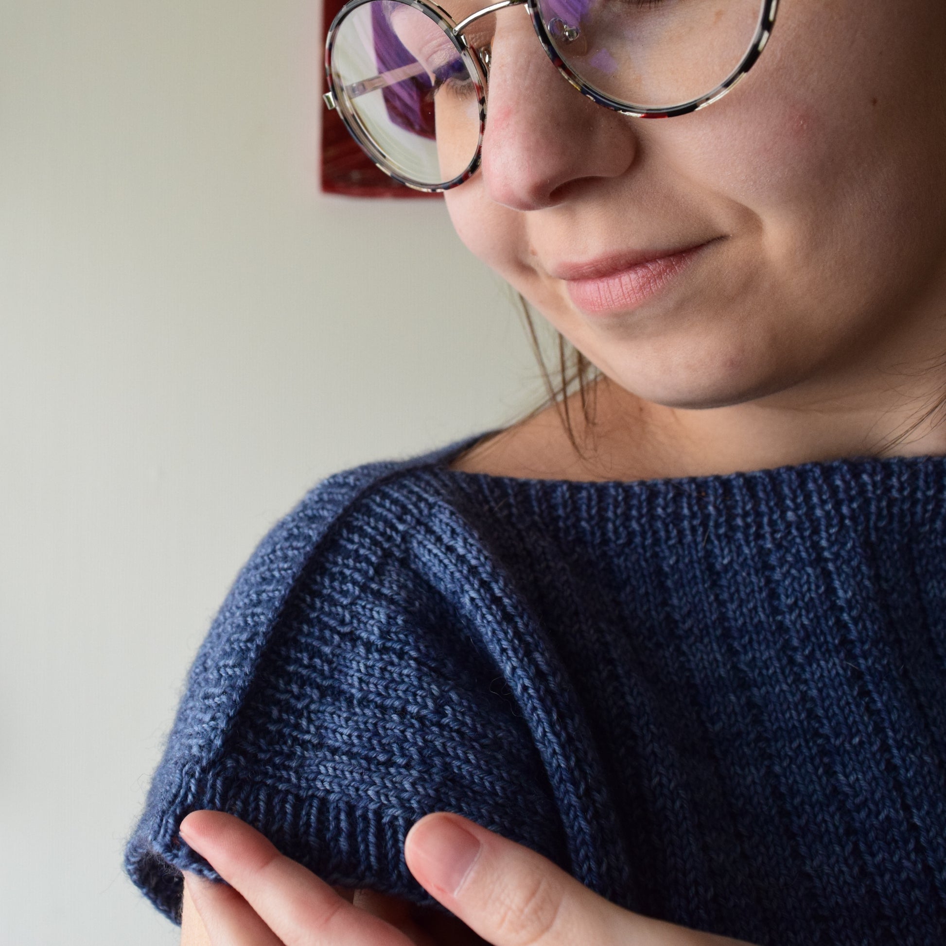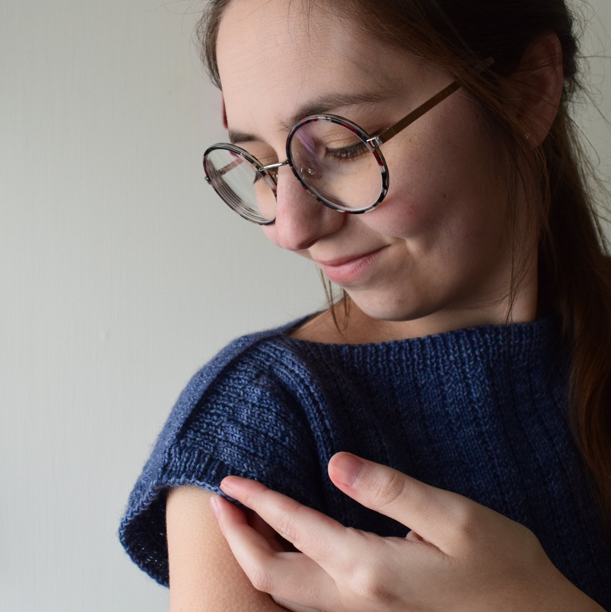The MOSI top is knitted bottom-up. In this process, the body is knitted in the round. Later, front and back are split and then you knit them back and forth separately. The shoulders are created by binding off the front and back together. Finally, the little sleeves are knitted in the round.