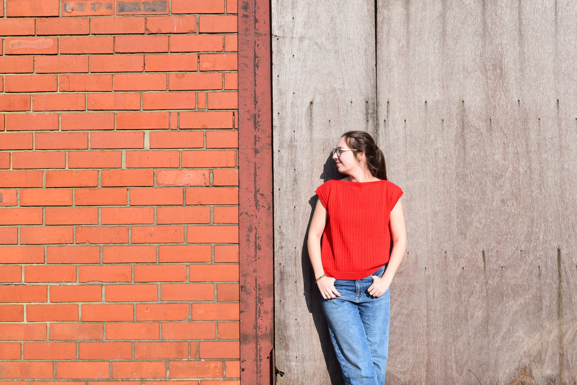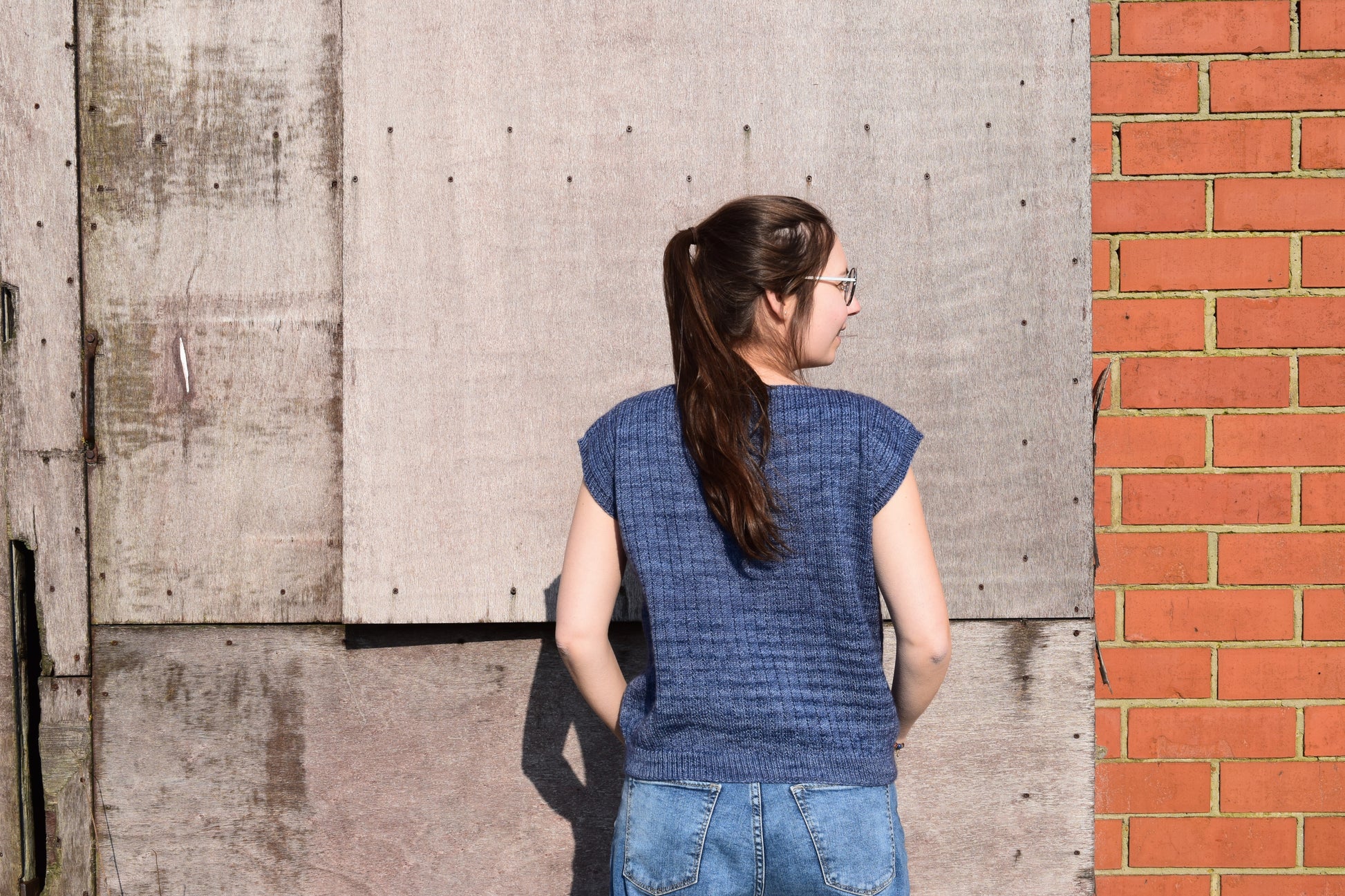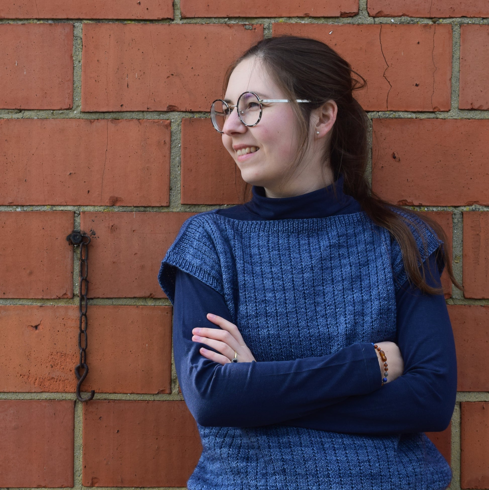 The MOSI top is knitted bottom-up. In this process, the body is knitted in the round. Later, front and back are split and then you knit them back and forth separately. The shoulders are created by binding off the front and back together. Finally, the little sleeves are knitted in the round.