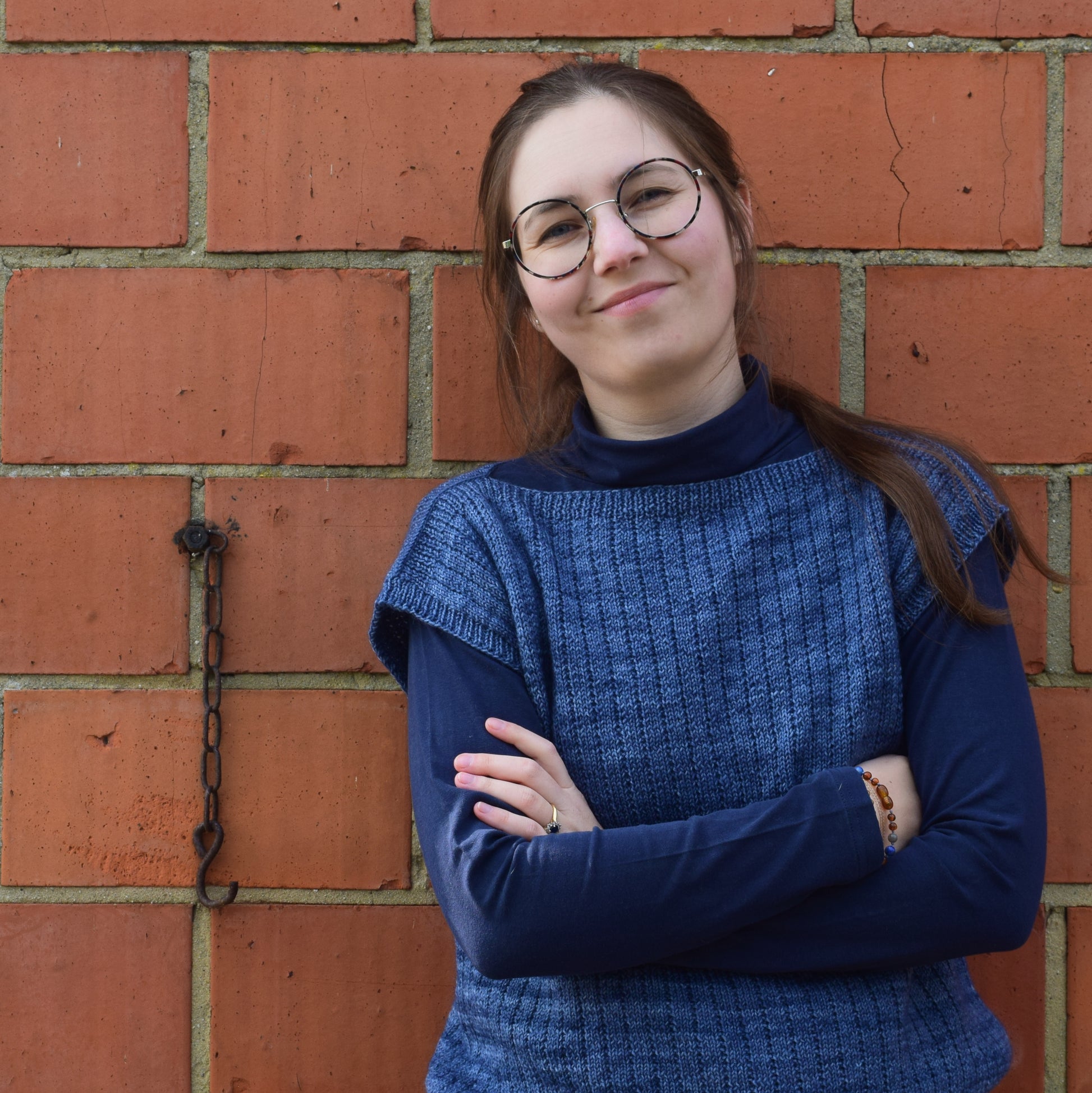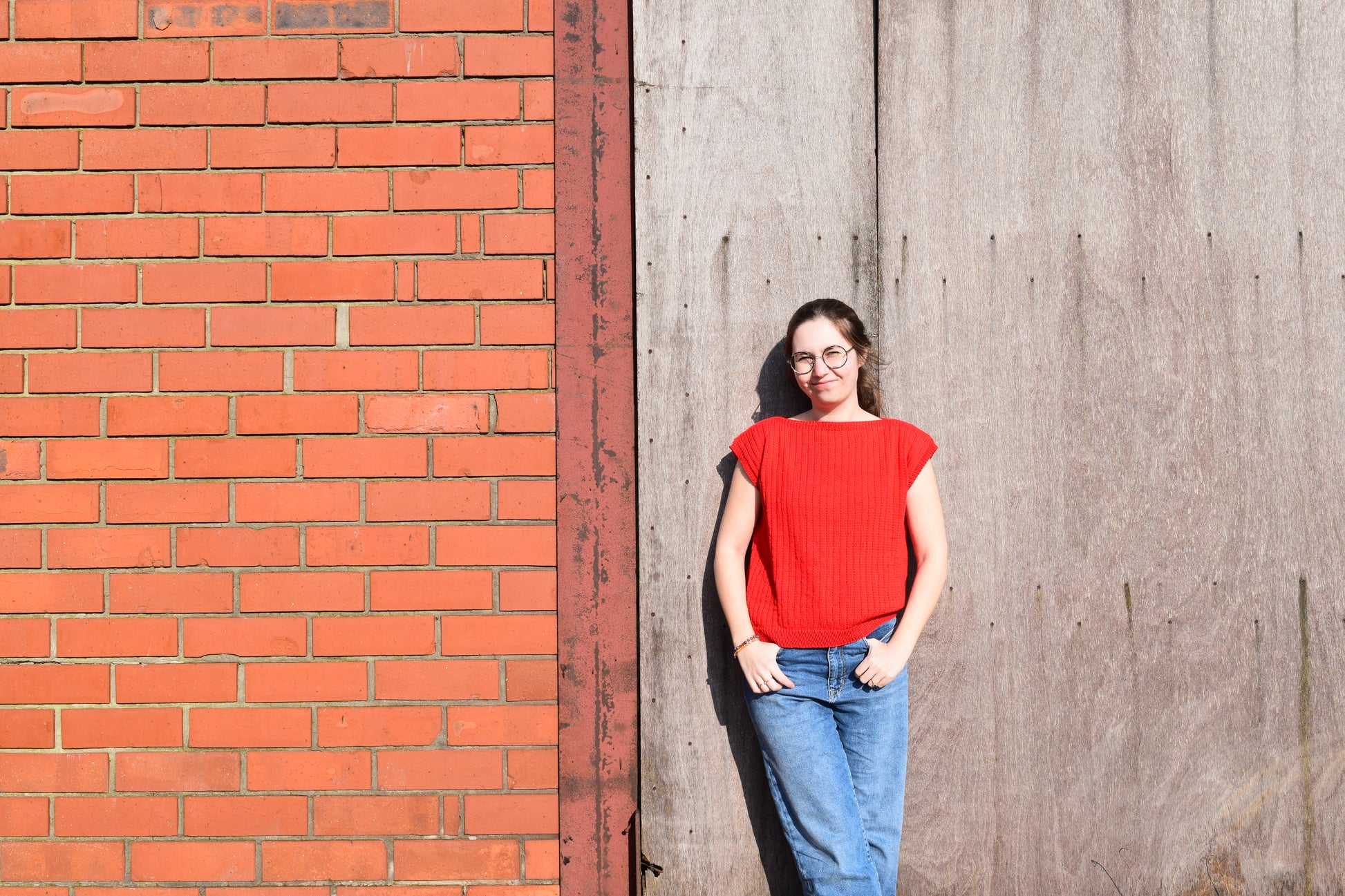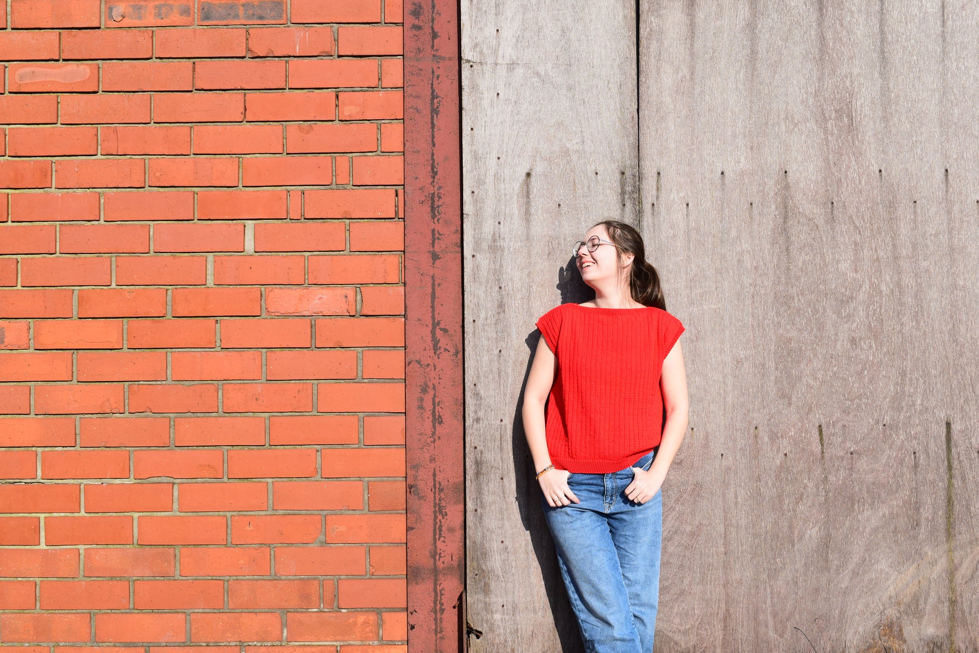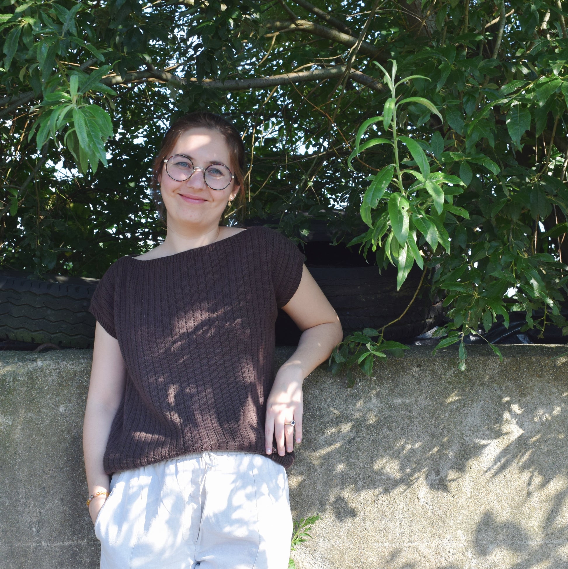 The MOSI top is knitted bottom-up. In this process, the body is knitted in the round. Later, front and back are split and then you knit them back and forth separately. The shoulders are created by binding off the front and back together. Finally, the little sleeves are knitted in the round.
