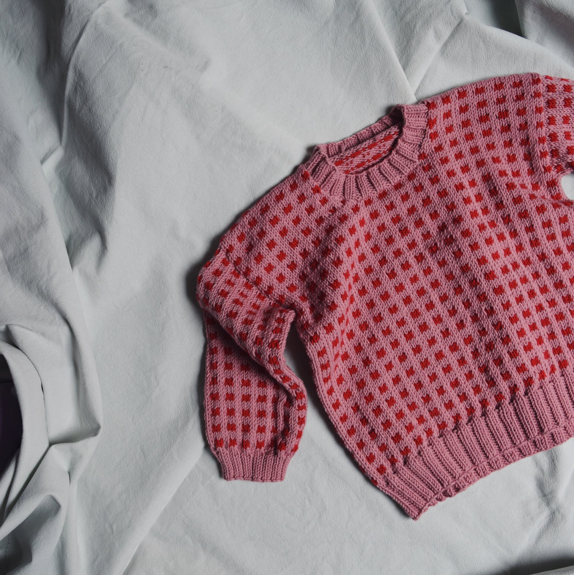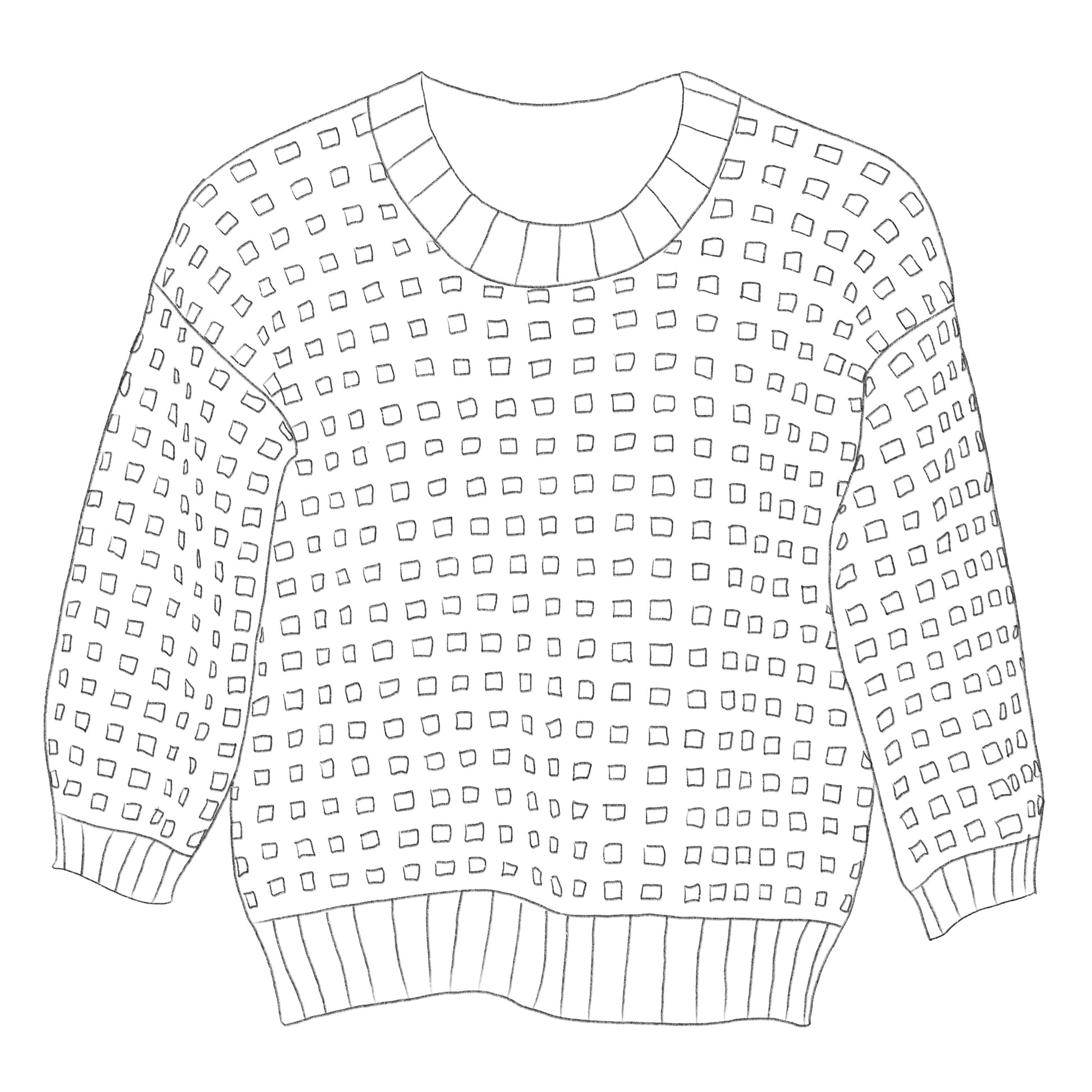 De trui is volledig gebreid in een stekenpatroon bestaande uit 2 kleuren: een hoofdkleur en een contrastkleur. Dit kleurwerk wordt gebreid door gebruik te maken van de “mozaïek-breitechniek”. Hierdoor brei je telkens maar met 1 draad/kleur per ronde.