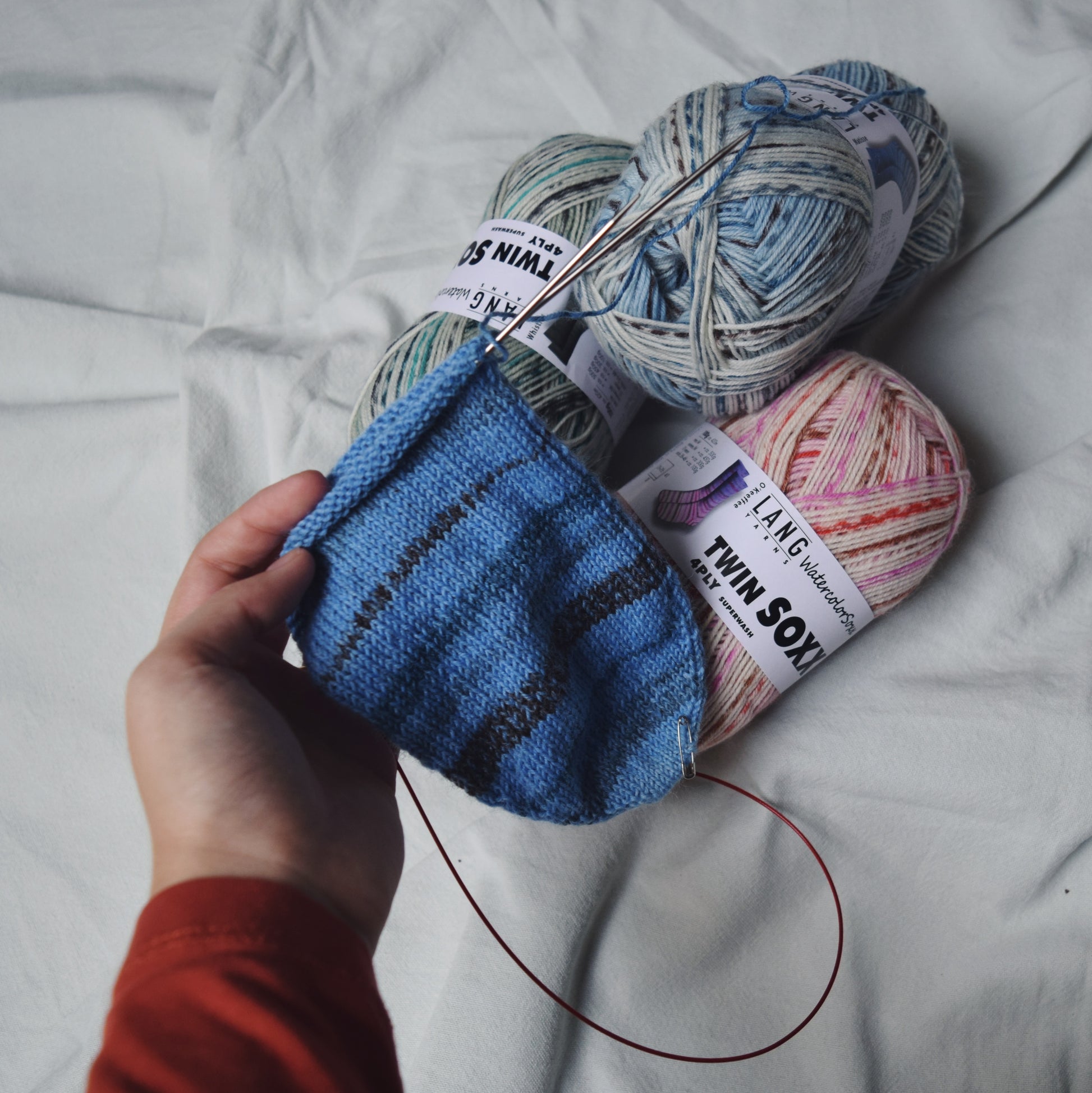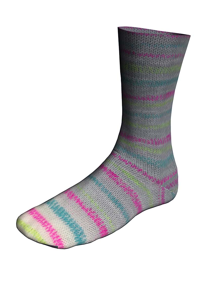 Met één bol van dit sokkengaren kan je twee identieke sokken breien. Begin de eerste sok met het garen van de binnenkant van de bol. Na 200 m vind je een stukje onbedrukt garen. Knip dit weg. Daarna begint dezelfde kleurherhaling opnieuw voor de tweede sok.